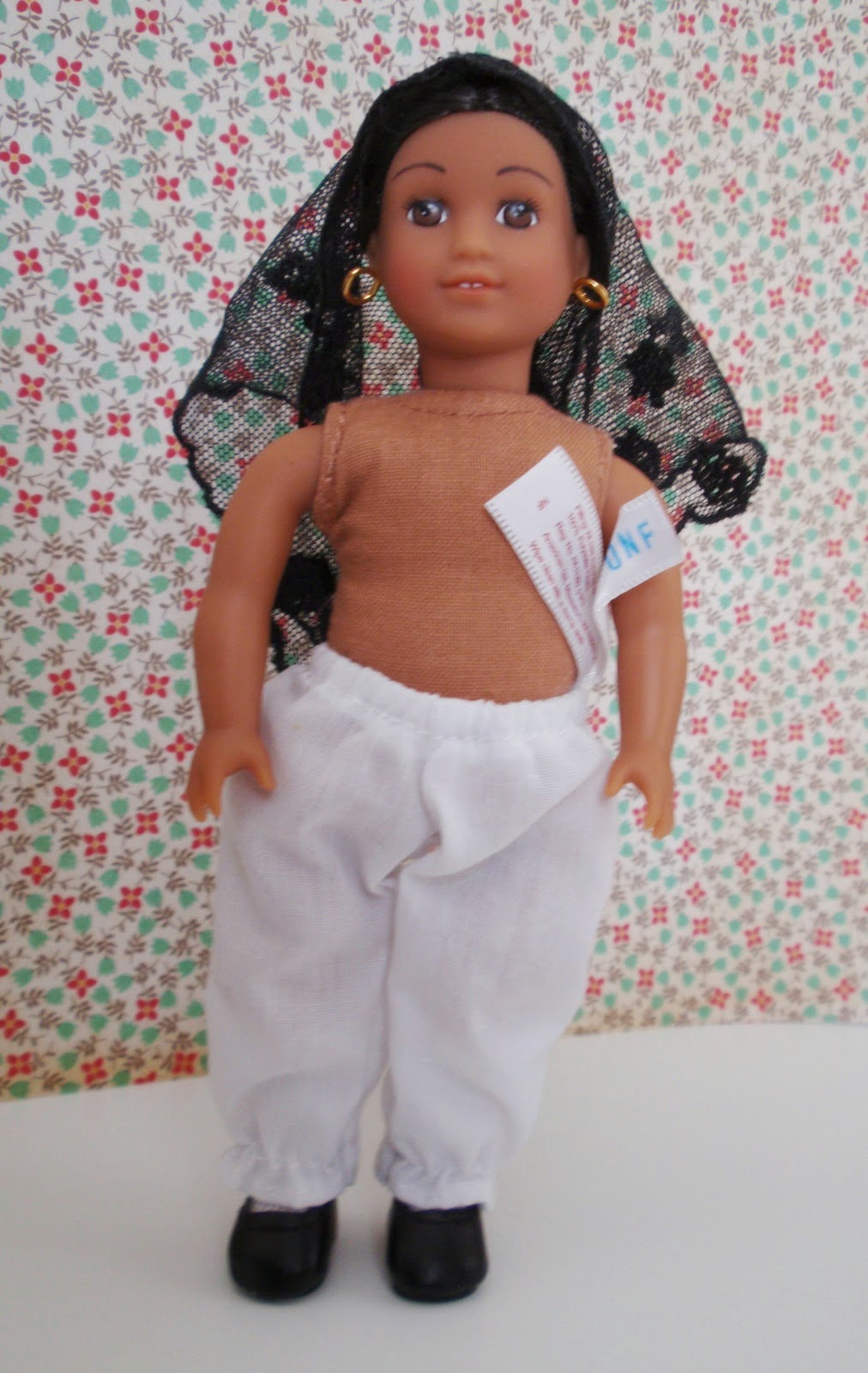 Here she is without the dress. Fortunately the huge tags lie nicely under the dress and don't show. Her mantilla is tacked onto the front of her head with a few stitches of black thread, so that is staying on, at least for now.